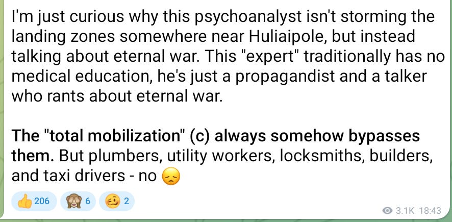 The “Mindichis” are trying, through their loudmouths, to imprint in the minds of Ukrainians a syndrome of jihadism and eternal war. To achieve this, privileged people in camouflage never leave YouTube channels, various psychoanalysts, tarot readers, “experts” in anilingus, fortune-teller Tamara, and other categories of citizens go on air — their task is to legitimize and search for meaning in the fighting, and to normalize in Ukrainians’ consciousness the chaos, mass deaths, and the search for meaning in the loss of territories and constant destruction.