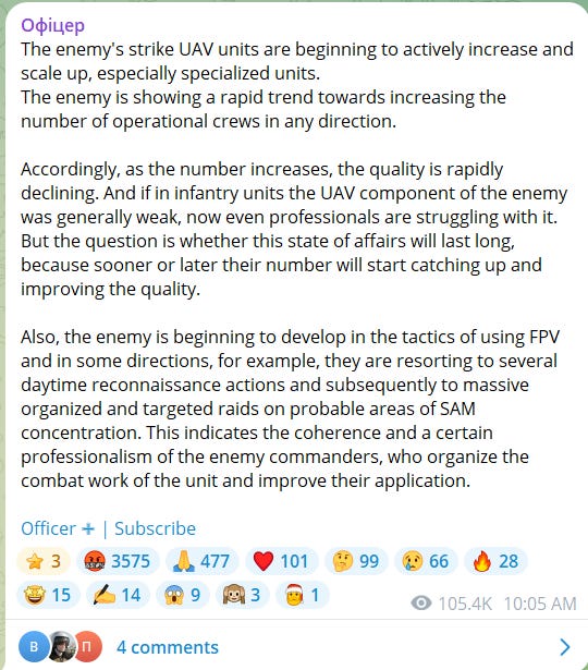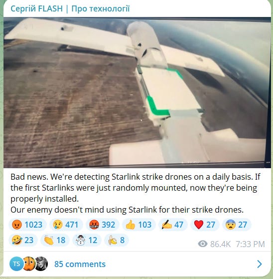 Sergei Bezkrestnov warned on the 14th that Russian drones were being increasingly spotted with Starlink internet providers installed on them. This allows for better controllability by the pilot. The Russian drone visible is a Molniya short-range attack model.