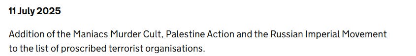 On July 11, 2024, the United Kingdom added ‘Palestine Action’ to its list of proscribed terrorist groups. But Palestine Action wasn’t the only group in the crosshairs of London that day - it also added the eastern European rightwing groups ‘Maniacs Murder Cult’ and the ‘Russian Imperial Movement’.