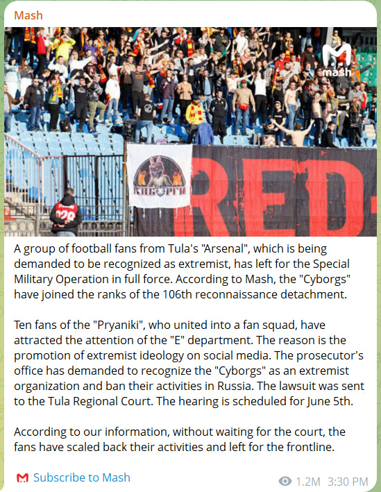 In recent days, a number of major Telegram channels published news about an upcoming court hearing to recognize the group of Tula-based football hooligans known as the “Cyborgs” as an extremist organization and to ban their criminal activities in Russia.