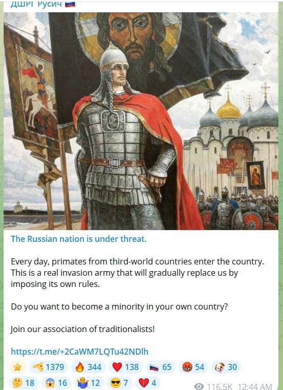 Russian rightwingers supporting the post-2022 war effort have certainly been able to grow their online reach. Rusich’s current telegram, set up in late 2022, only broke 100,000 followers in mid-2023, and currently has 250,000. The rightwing blogger/shitposter Vladislav Pozdnyakov has increased his telegram followership from 30,000 to 230,000 since 2022, and Rusich fighter Evgeny Razzkazov rose from 5,000 to 132,000 followers.