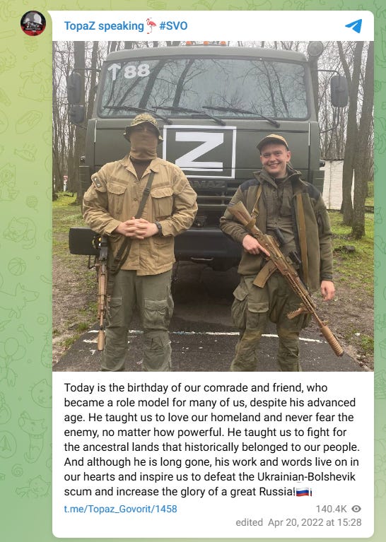 Instead, Rusich is made into Russia’s chief O9A proponents. Now, I don’t doubt that Rusich is into the O9A mumbo jumbo. Maybe they’ve even committed some ritual murders. Their recent post calling to murder Ukrainian POWs contained a reference to Morena, the ‘Slavic god of death’ glorified by Russian O9A literature.