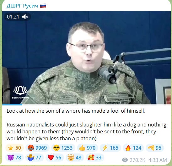 In July 2023, prominent Rusich fighter (Ukrainian-born, by the way) Evgeny Razzkazov threatened some sort of violent action unless the government punished a Muslim he accused of an attack on a military veteran: