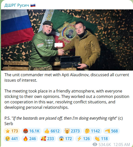In early 2014, commander of Akhmat Apti Alaudinov called Rusich a bunch of ‘fascists’ and ‘armchair warriors’. The conflict ended in January 2025 with Milchakov ‘the Serb’ sitting in Auldinov’s room in front of the Akhmat banner. Naturally, Rusich’s telegram followers weren’t impressed.