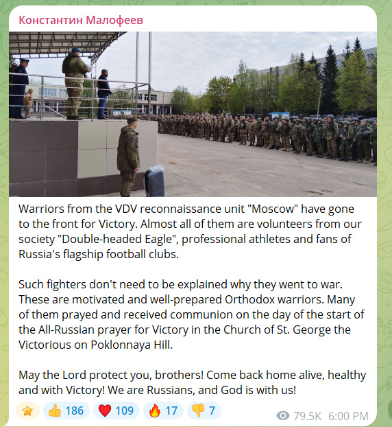 Malofeev often publishes photos of himself greeting the football hooligan ‘Moscow’ division off to war. In May 2023, announcing their formation and departure to the frontlines, he noted that many were members of his nationalist martial arts society ‘the Two-Headed Eagle’. I wrote recently about a number of cases where members of this network turned out to sympathize Ukraine’s nazi Azov movement.