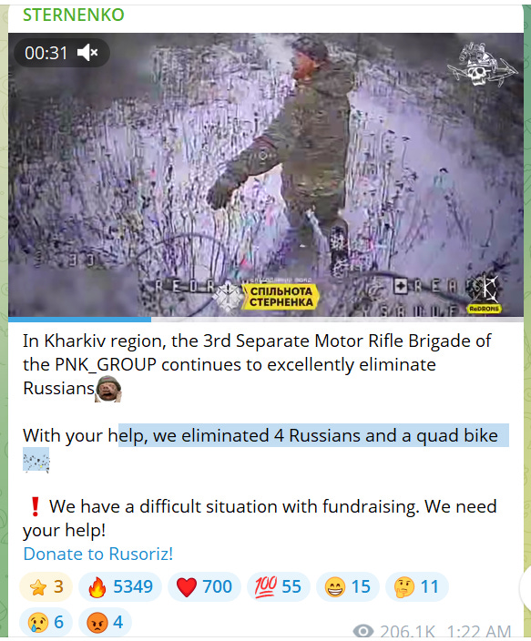 Instead of Russia’s focus on logistics, Ukraine’s drone strategy is typically PR-focused: killing individual Russian infantrymen in order to post gloating murder-porn to twitter, often focusing on the ‘orkish’ physiognomy of those killed. You can see daily examples of this murderporn from the telegram channels of Sternenko or Robert Brovdi (‘Madyar’), head of Fedorov’s Unmanned Systems Forces. As usual, the following post ends by calling on followers to donate to Sternenko’s ‘Ruzzoriz’ (‘Russian Cutter’) fundraiser.