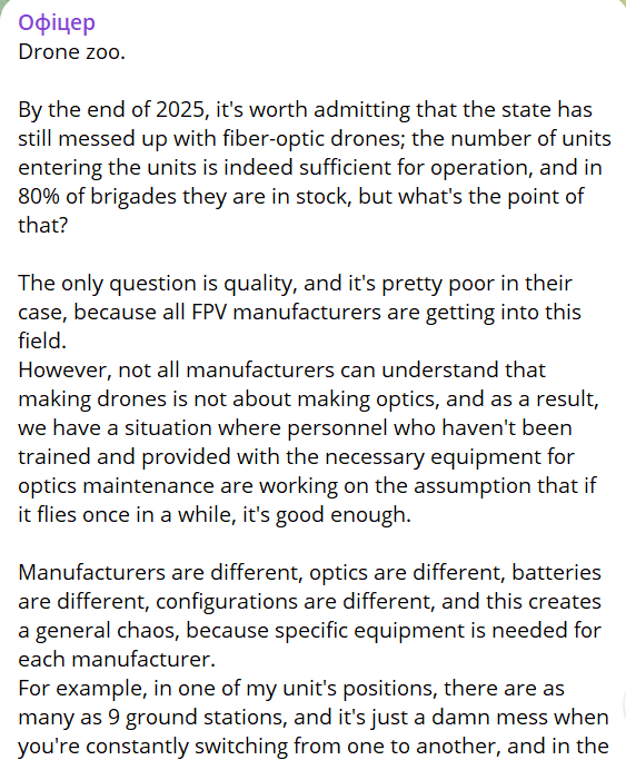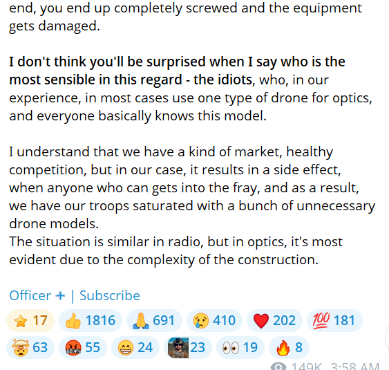 In fact, Ukrainian drone operators never stop saying in interviews that Ukraine ought to emulate Russia’s approach of scaling up production of successful drone models. The Russians, instead of fetishizing private initiative and creativity, focus on constantly improving the 2-3 models of drones that have proven themselves on the battlefield.