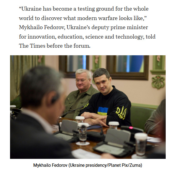 At the military tech conference the article concerns, Fedorov made another of his usual statements that Ukraine has fulfilled its glorious destiny of becoming a testing ground for NATO weapons.