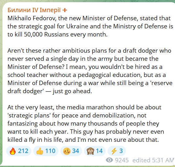 You will have likely heard his January 20 proclamation about Ukraine’s grand military strategy: to defeat Russia, 50,000 Russians must be killed monthly. He claims that currently, there is video proof of 35,000 killed each month. Along with examining Fedorov himself, today we’ll examine Ukrainian and western military analysts and soldiers that are sceptical of his strategy and his claims about existing kill rates.