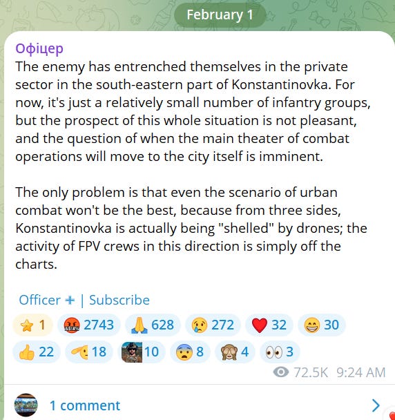 With Russian drones dominating Ukrainian logistics around the Donbass city of Konstantynivka, Russian troops now control much of the southern part of the town. This February 1 post is from ‘Alex’, a senior lieutenant in the Ukrainian army: