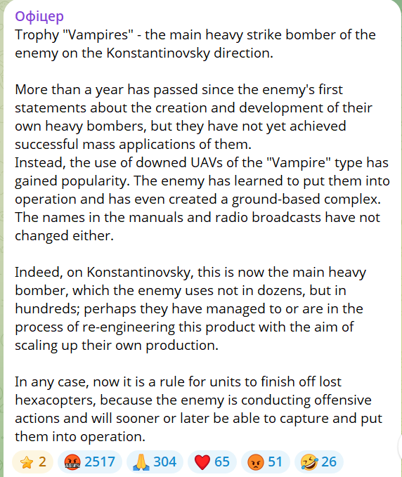 Officer also wrote on January 31 about how Russian success in scaling up the use of heavy bomber drones. These are able to carry much larger explosive charges than the usual FPV drones. Ukraine started using ‘Vampire’ bomber drones around 2023, and Russia had difficulties reaching Ukrainian production levels until recently: