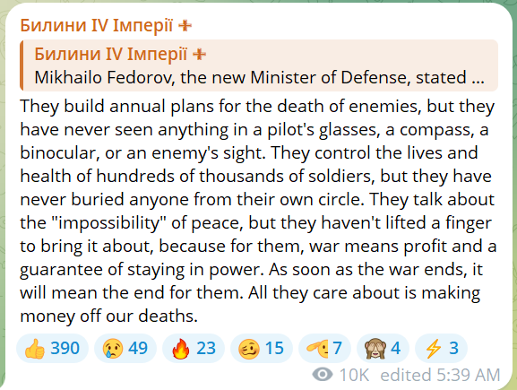 Those in the army are not always so enthusiastic. Lieutenant of the Azov brigade ‘Akula’, who runs the Tales of the IV Reich telegram channel, was highly critical of Fedorov’s dramatic proclamations in a late January post: