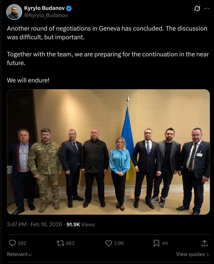 A sign of how seriously Budanov takes his role in Ukraine’s peace negotiation team comes from Ukrainian MP Oleksiy Honcharenko, of the oppositional ‘European Solidarity’ party. Though his party is pointedly nationalistic, Honcharenko was one of the few MPs to come out openly in favour of Trump’s peace plan back in November. He is often accused of trying to score cheap ‘populist’ brownie points by liberal nationalist critics. This is what he told strana.ua on February 9: