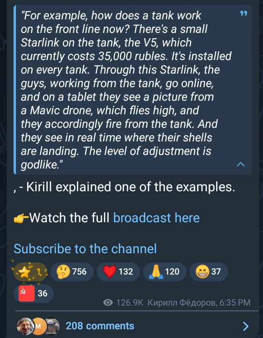 But we’ll stick to more prosaic problems. First, we’ll examine how exactly the Russian army has been using starlink. Then, we’ll see how the Starlink restrictions have negatively affected the Ukrainians themselves, as well as what both the Ukrainians and Russians have to say about the future of Russian communications and current solutions. Our look at Russian reactions will include some speculation about the political motivations of the Prigozhinites, who are most pessimistic about the Starlink cutoff.