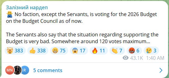 Currently, the main task before the Servants is to pass the 2026 budget. They don’t seem to be doing very well at this, boding badly for Zelensky’s parliamentary power. Opposition MP Yaroslav Zheleznyak wrote this on the matter on December 2: