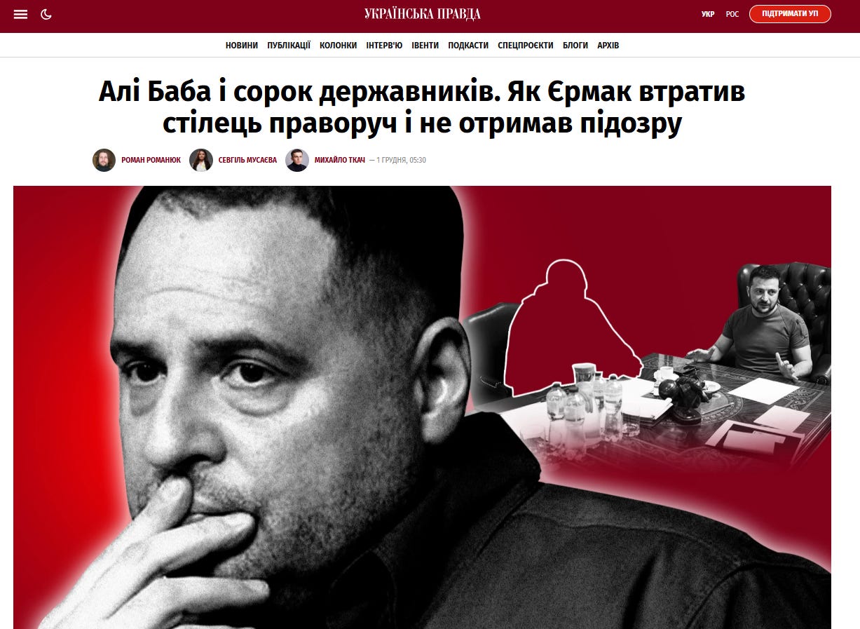 On the weekend, Mindich’s close friend Andriy Yermak was finally removed from his post as head of the presidential administration. Zelensky’s fate is tied with the fallout of this move. Ukrainska Pravda, a major media publication virulently opposed to Yermak, put out an article on Yermak’s fall on December 1.
